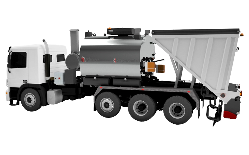 K-chip combi, Asfalt distribütörü ve mıcır sericiyi bir araya getiren kombine sathi kaplama makinasıdır.